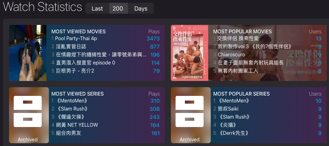 用戶統計:單一帳號最高點播次數達 2360 次;總播放時數為 4週 3日 23小時 8分鐘。此非粗略統計,媒體庫重新整理仍在進行中,相關變動會影響排名統計。